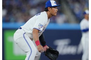 2026.03.28米大リーグ・ブルージェイズの岡本和真内野手は27日(日本時間28日)、本拠地でのアスレチックスとの開幕戦に「7番・三塁」で先発し、メジャーデビューを果たした。3打数2安打1四球をマークし、チームの3-2のサヨナラ勝ちに貢献した。試合後にはNHK-BSのインタビュー中にチームメートから粋な歓迎を受けていた。