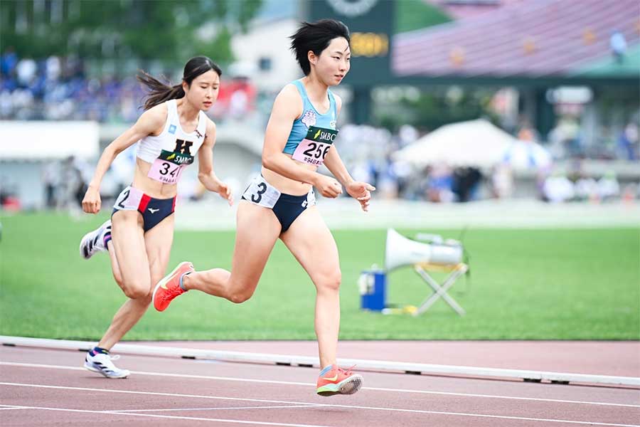 オープンレーンになり、7番手に付けた勝。森千莉 (至学館大・2年)、西田有里(立命大・2年)が残り6人をちぎる展開になると、勝は素早く反応し、外側から追い上げて300メートル地点で3番手に浮上した。ラスト1周、前を走る2人を猛追し、ラスト100メートルでは後方から迫ってきた長谷川麻央(京都教育大・4年)との競り合いに。上位2人はとらえられなかったものの、長谷川を0秒07差で制して2分06秒31の3位に滑り込んだ。