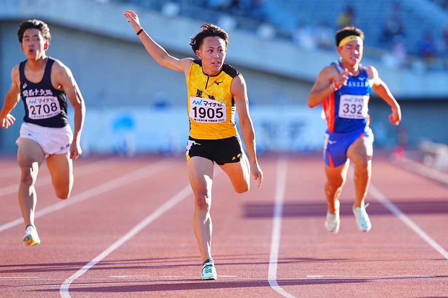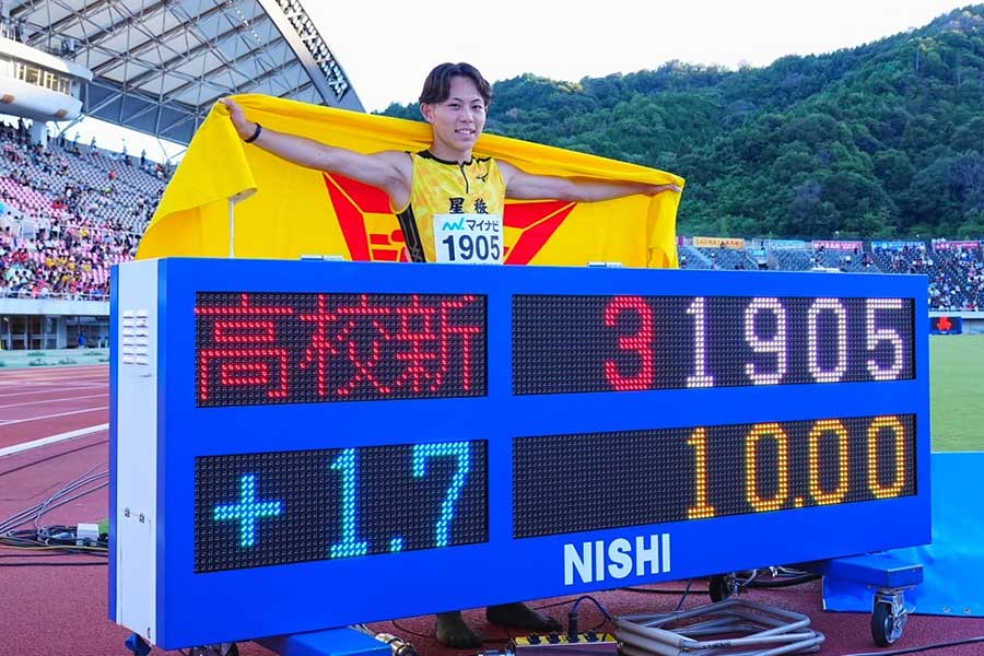 「自分でも衝撃のタイム。10秒1台を飛び越えて0台が出せて嬉しい。最終組で追い込まれる状況ってものがあってのこのタイムだと思う。伝説を作ったのかなという気がします」。1000分の1秒まで発表されたタイムは「9秒995」。200メートルでは追い風参考(2.7メートル)ながら、サニブラウン・ハキームが持つ日本高校記録まで0秒05に迫る20秒39で目標の2冠を達成。4×100メートルリレーも含め、計6本のレースを走り切った。