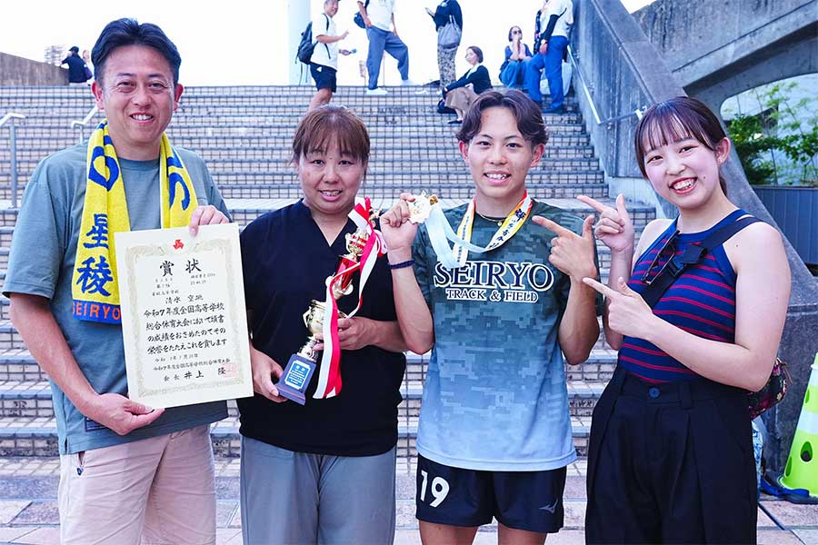 陸上インターハイ(ホットスタッフフィールド広島)男子100メートルで10秒00(追い風1.7メートル)の日本高校新記録を記録し、200メートルとの2冠を達成した星稜の清水空跳(2年)。100メートルは桐生祥秀の従来記録(10秒01)を12年ぶりに塗り替え、200メートルでは追い風参考ながらサニブラウン・ハキームが持つ高校記録(20秒34)まで0秒05に迫った。一躍、時の人となった16歳。石川・金沢から応援に駆け付けた家族がその素顔を明かした。(取材・文=THE ANSWER編集部・山野邊 佳穂)