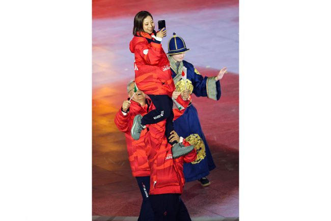 Riku Miura of Team Japan is carried into the Closing Ceremony of the Milano Cortina 2026 Olympic Games at Verona Arena in Verona, Italy, on Sunday, February 22, 2026. Norway won the most medals with a total of 41, with the United States following at 33. Photo by Aaron Josefczyk/UPI