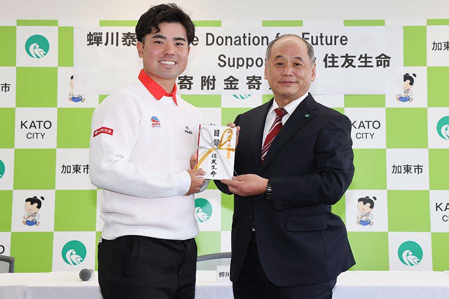 男子ゴルフの蝉川泰果は17日、地元の兵庫・加東市役所で「蝉川泰果 Eagle Donation for Future Supported by 住友生命」の寄付金贈呈式に出席した。