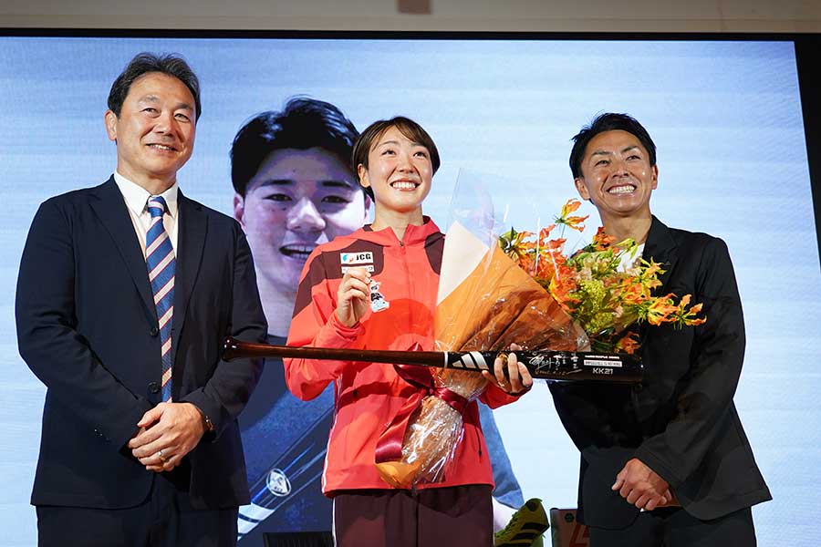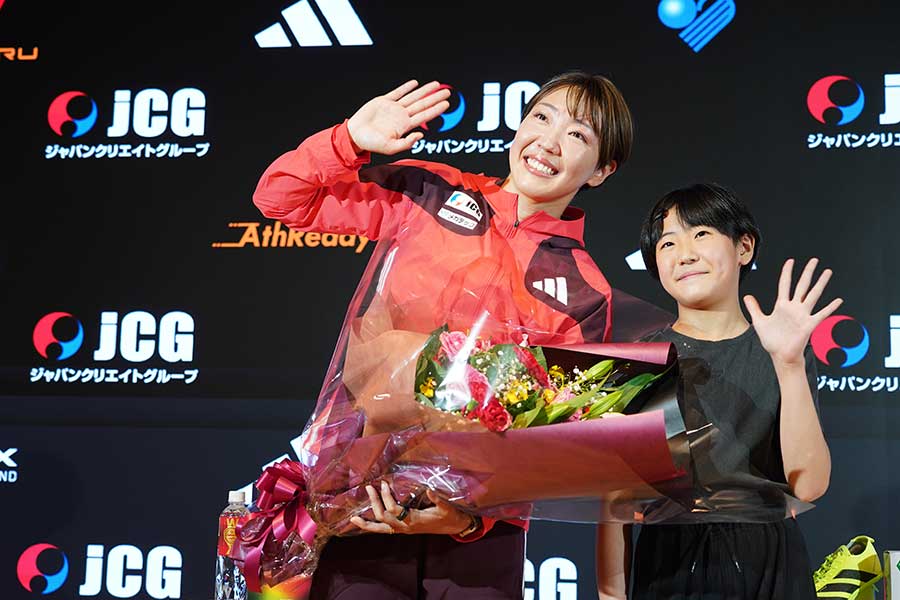 この日はマネージャーの夫・峻一さん、小学5年の長女・果緒さんも見守った。写真撮影を終え、最後には果緒さんも登場し「22年間お疲れ様でした」と照れくさそうに花束贈呈。「陸上をやってきたママに新しいスタートのタイミングで気持ちを渡すことができて嬉しかったです」と語り、サプライズづくしの会見となった。