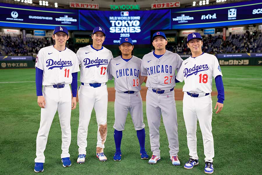 3月18日、19日に東京ドームで行われた開幕シリーズ。第2戦の試合後には、ドジャースの大谷翔平、山本由伸、佐々木朗希、カブスの今永昇太、鈴木誠也がグラウンドで記念撮影をした。