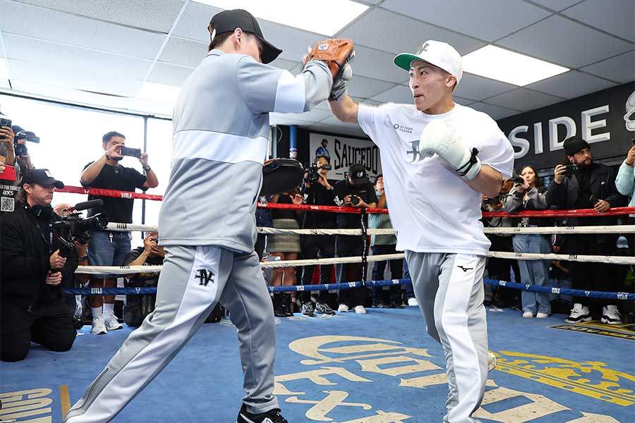 抜群のインパクトだった。白のキャップをかぶり、やはり白いグラブをつけた井上。ヘビーバックを前に、「ハッ」と声を上げながら気合十分に左フックなどを打ち込んだ。ミット打ちではフットワークも軽く、鋭いパンチを繰り出すと「ドスン」と凄まじい衝撃音。井上の気迫あふれる声も響いた。