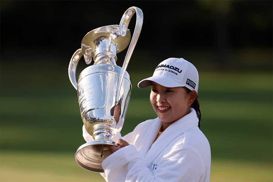 優勝について問われると「プロゴルファーになるって決めた時からLPGAツアーで戦いたい気持ちが強くて、メジャーで優勝することが目標だったので、達成することができて嬉しいです」と笑顔。内容については「正直、後半にスコアを落としてしまったのでこのまま優勝できないんじゃないかと思ったけど、ファンの方とともに戦う気持ちで頑張りました」と振り返った。