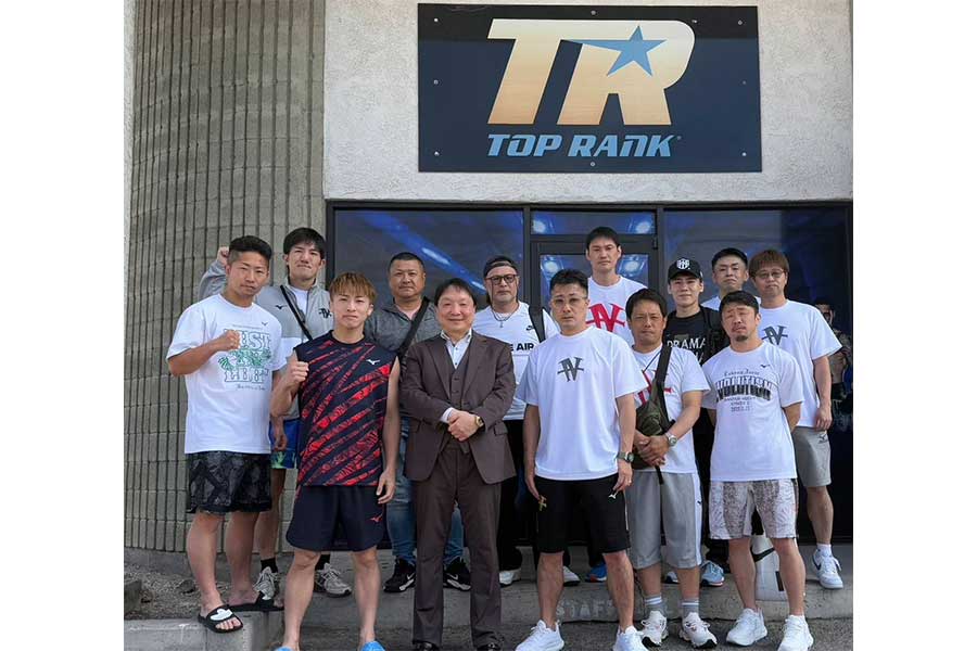 チーム一丸となって決戦に臨む。大橋ジムの大橋秀行会長、井上を支えるトレーナーの佐久間史朗氏、松本好二氏、北野良氏らが合流した。大橋ジム陣営は契約を結ぶ米興行大手「トップランク」の前で記念撮影。井上は笑顔を見せる大橋会長の隣でガッツポーズをした。