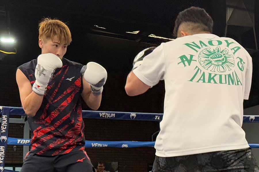 井上は米興行大手「トップランク」のリングで弟・拓真と対峙。10回のマスボクシング、ミット打ち、サンドバック打ち、シャドーを行い、汗を流した。