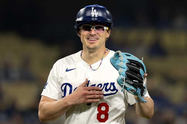 LOS ANGELES, CALIFORNIA – APRIL 29: Enrique Hernández #8 of the Los Angeles Dodgers reacts after a pitch during the ninth inning against the Miami Marlins at Dodger Stadium on April 29, 2025 in Los Angeles, California. (Photo by Katelyn Mulcahy/Getty Images)