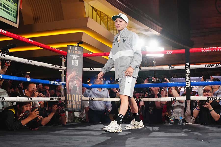 グレーのウェアに身を包んだ井上はリングに上がり、米ファンの歓声に応えた。その後、会場のインタビューに臨み「4年ぶりにラスベガスに戻って来られて非常にワクワクしています」とし、「ここラスベガスで何を求められているかは承知で来ている。期待に応えるボクシングを見せたい」と続けた。