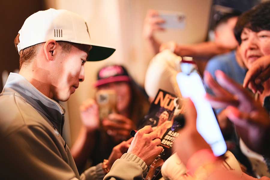 インタビュー後は退場となったが、出口付近で足を止めた井上。おもむろに振り返ると、待っていたファンの元へ。グラブにサインするなど粋なファンサービスを行った。
