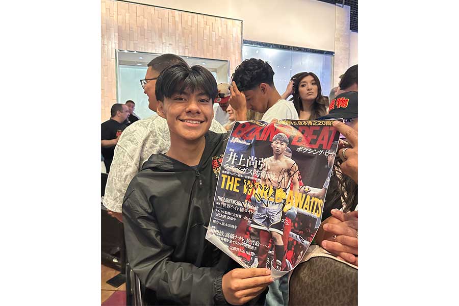 そこまでするのは「息子のためなんだ」。フェルナンデスさんが指差した先にいたのは16歳のエミリアーノ・フェルナンデスJr.さん。日本語で「怪物」と書かれたジャケットを羽織り、井上が表紙を飾った雑誌のコピーを広げてくれた。サイン入りだ。11歳からボクシングを始め、プロになるため練習を積んでいる。モンスターは憧れの存在。「彼のようになれるように頑張っているよ」とはにかんだ。