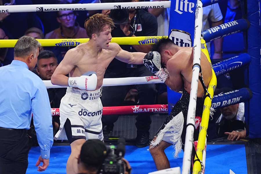 井上は2回、右ストレートを受けて鼻血。終盤には打ち終わりにカウンターの左フックを受け、まさかのダウンを奪われた。昨年5月のルイス・ネリ戦以来、試合ではアマチュア時代を含めて人生2度目のダウン。以降は多彩なパンチで猛攻に出た。7回は右ショート4連発を浴びせ、ダウンを奪取。8回にフラフラの相手を攻め立て、レフェリーストップを呼び込んだ。
