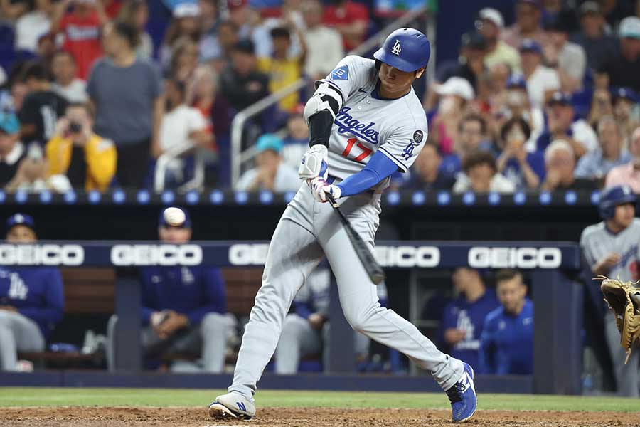 米大リーグ・ドジャースの大谷翔平投手は6日(日本時間7日)、敵地マーリンズ戦に「1番・DH」で先発出場。5打数2安打2打点の活躍もチームは延長10回に4-5で敗れた。1-2で迎えた6回に2戦連発となる10号同点ソロ。球団公式がインパクト直後の美しいバットフリップの瞬間を捉えた写真を投稿すると、米ファンを熱狂させている。