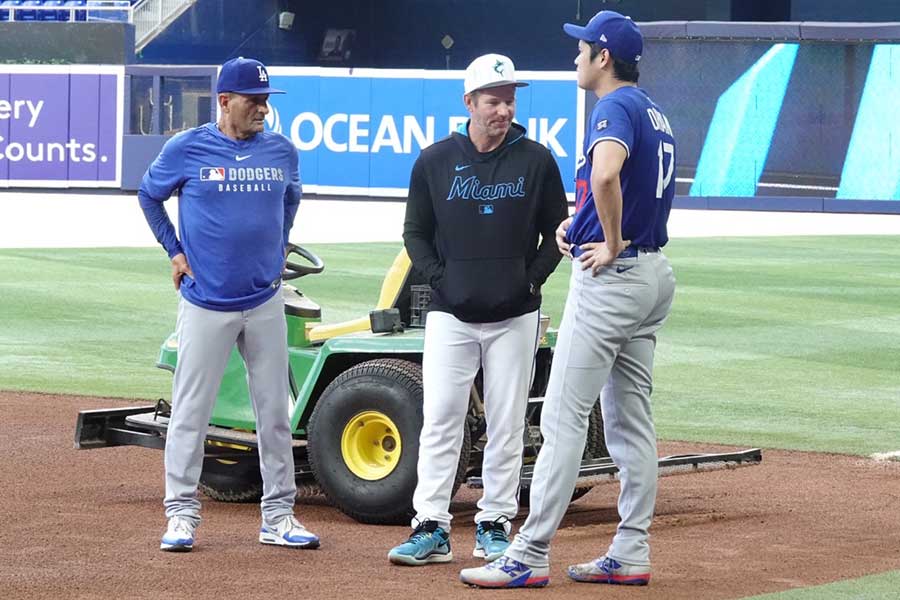 米大リーグ・ドジャースの大谷翔平投手は7日(日本時間8日)、敵地マーリンズ戦に「1番・DH」でスタメン出場する。昨季までドジャースでともに戦い、今季からマーリンズを率いるクレイトン・マッカロー監督と試合前に談笑。和やかな雰囲気も広がった。