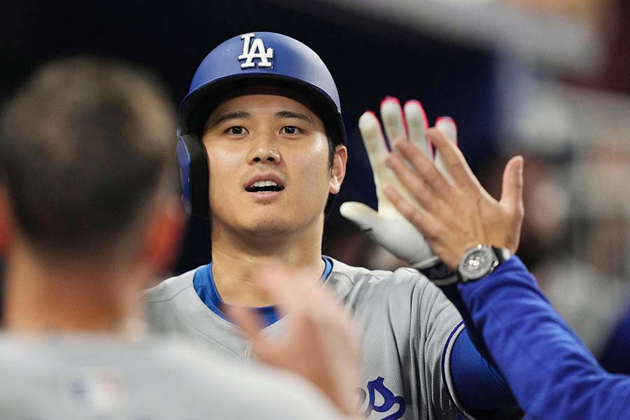米大リーグ・ドジャースの大谷翔平投手は7日(日本時間8日)、敵地マーリンズ戦に「1番・DH」で出場。6回の第3打席では右中間への三塁打を放ち、その後先制のホームを踏んだ。米メディアは、三塁塁上で喜ぶ大谷の背後のマーリンズファンがとった驚きの行動に注目している。