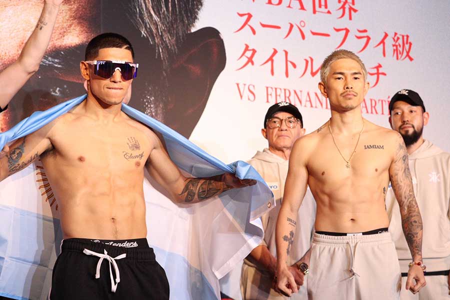 ボクシングのWBA世界スーパーフライ級(52.1キロ以下)タイトルマッチが11日、東京・大田区総合体育館で行われる。10日は都内で前日計量が実施され、前同級王者・井岡一翔(志成)が51.9キロ、現王者フェルナンド・マルティネス(アルゼンチン)が51.9キロでパスした。昨年7月以来のダイレクトリマッチ。初防衛戦に臨む王者はサングラス姿を統一する理由に「恥ずかしがり屋なので」と赤面した。興行はABEMAで無料生配信。戦績は36歳の井岡が31勝(16KO)3敗1分、33歳のマルティネスが17勝(9KO)。