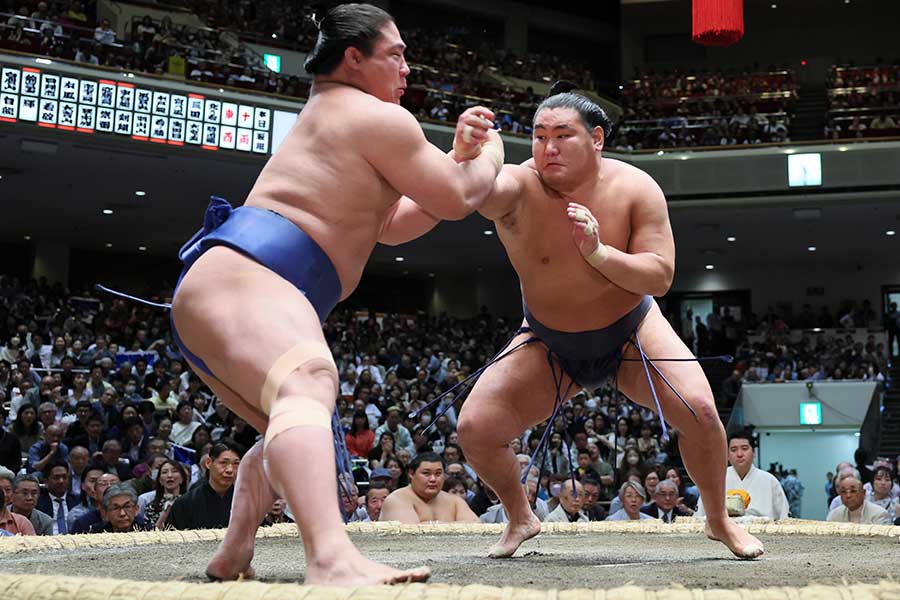 綱取りを目指す大関・大の里(二所ノ関)は、幕内・若元春(荒汐)を寄り切って白星発進。大関・琴櫻(佐渡ケ嶽)は、幕内・王鵬(大嶽)に肩透かしで敗れた。