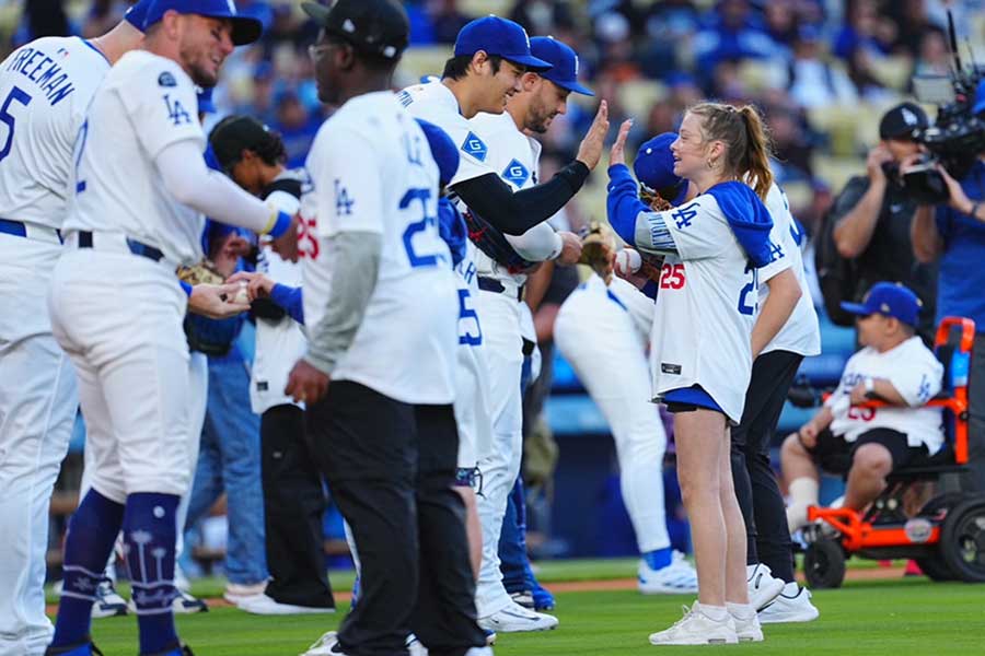 アスレチックス戦前のホームベースの近辺。大谷のほかフリーマン、ベッツらドジャースの7選手が横一列に並んだ。向かい合うように7人の少年少女がボールを持ち、投球。捕手役の大谷は少女のボールをノーバウンドでつかみ、笑顔で近づいた。