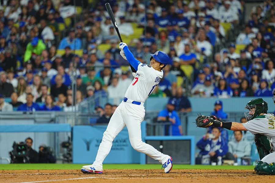 米大リーグ・ドジャースの大谷翔平投手は15日(日本時間16日)、本拠地アスレチックス戦に「1番・DH」で先発。3回1死一、二塁の好機で左翼に14号3ランを放つと、4回には2打席連発となる15号中越え2ランを放った。今季初の1試合2発で、年間本塁打ペースは昨季の54本を超える「55本」ペースに突入。チームは19-2で勝利した。一方、2010年にアスレチックスで完全試合を達成している解説のダラス・ブレイデン氏は試合中にSNSを更新したが、大敗にも平常運転だった。