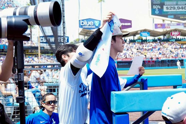 山本由伸のレンズに映った男の正体は…照りつけるLAの太陽、佐々木朗希にはイタズラっぽく気遣い 2025.05.19 著者 : THE ANSWER編集部 キーワード : ドジャース • 佐々木朗希 • 大谷翔平 • 山本由伸 Twitter Facebook B!Bookmark 大谷が佐々木朗希にそっとタオルを被せてあげる実際のシーン【写真:荒川祐史】 【画像】由伸のサングラスに映った男は…正体判明の1枚