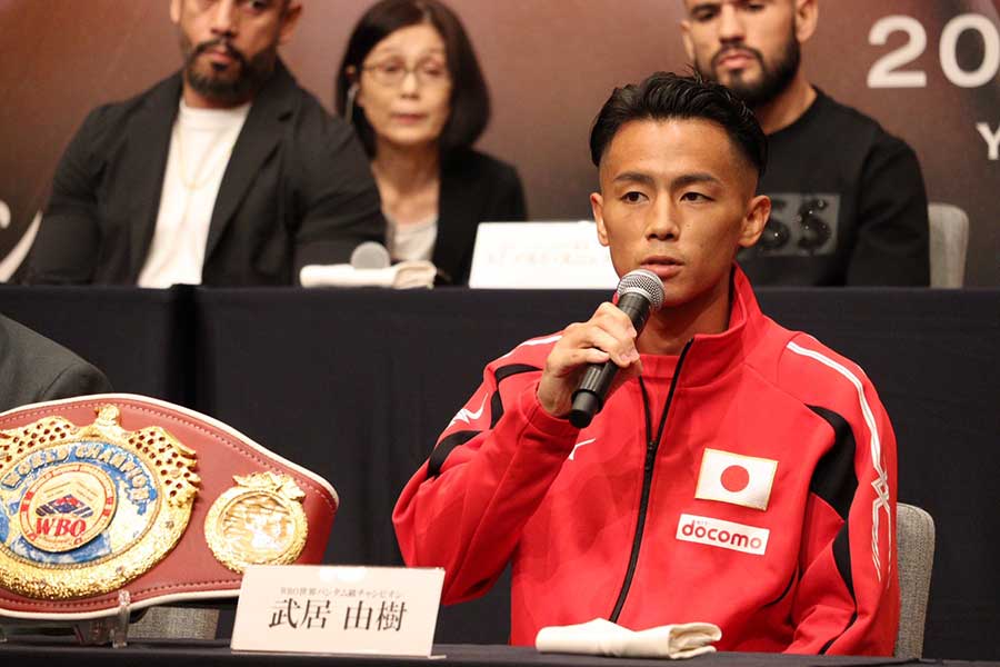 ボクシングのダブル世界戦興行に出場する選手たちが26日、神奈川・横浜市内のホテルで会見した。28日に横浜BUNTAIで行われ、WBO世界バンタム級王者・武居由樹(大橋)は同級8位ユッタポン・トンデイ(タイ)と2度目の防衛戦に臨む。「一方的にただ殴る」などと強気発言を連発した。興行はNTTドコモの映像配信サービス「Leminoプレミアム」で有料生配信。戦績は28歳の武居が10勝(8KO)、31歳のユッタポンが15勝(9KO)。
