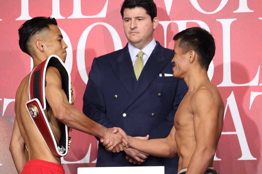 計量はボクシングでは珍しい一般公開で行われた。王者・武居の登場に「よしきー!」の声援。バキバキに仕上がった肉体美を披露し、堂々のリミットパスだ。「ここ最近で一番、減量が上手くいった。ちゃんとしたバンタム級は3回目。減量の仕方がわかってきた」。約20秒のフェースオフで睨み合ったが、最後は笑顔で握手。友好ムードが漂った。