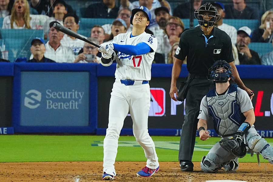 米大リーグ・ドジャースの大谷翔平投手は30日(日本時間31日)、本拠地ヤンキース戦に「1番・DH」で先発出場した。初回の21号に続き、6回の第3打席で22号を放った。右翼を守るヤンキースのアーロン・ジャッジ外野手の頭上を越える一発だったが、この22号で生まれた記録をメジャー公式記者が紹介した。
