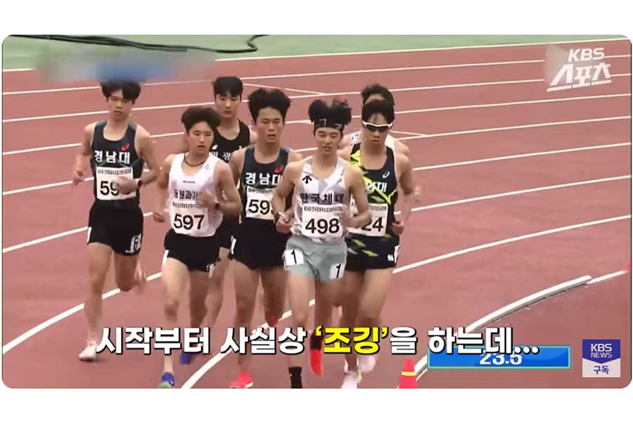 5月21日に韓国・ミリャン(密陽)で行われた全国大会の男子3000メートル障害。大学の部は異様なレースとなった。スタートラインに立った7人は、まるでジョギングのようなゆっくりとしたペースでトラックを回り、集団を崩さない。走りながら、隣の選手と言葉を交わす場面までカメラに抜かれている。これを中継内で猛批判したのが、解説のユン・ヨチュン氏だ。