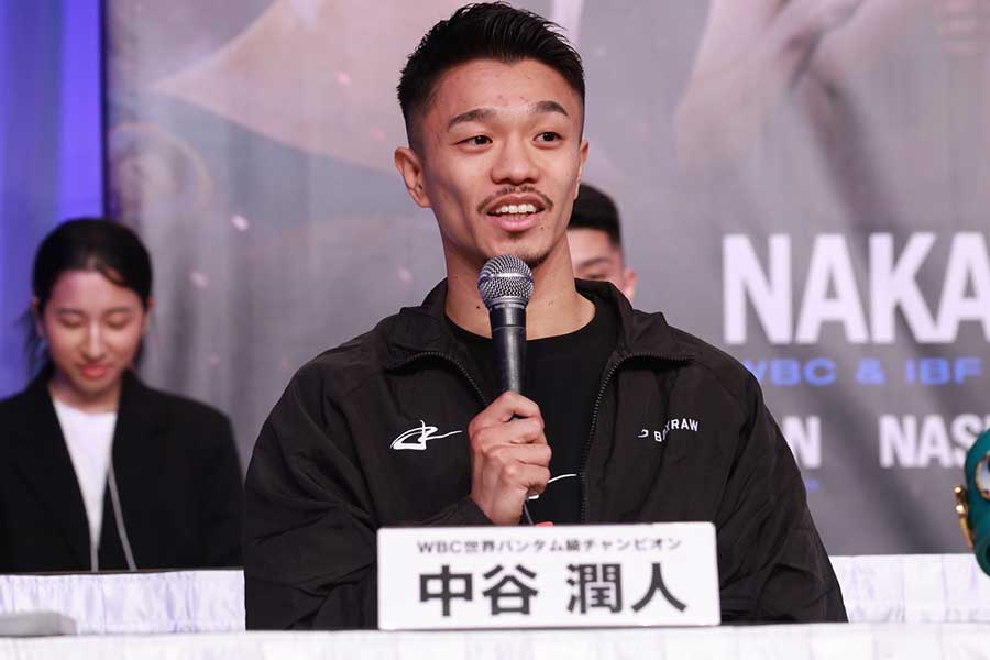ボクシングのWBC世界バンタム級王者・中谷潤人(M.T)とIBF同級王者・西田凌佑(六島)が8日に、東京・有明コロシアムで王座統一戦を行う。6日は両選手のほか、興行に出場するWBC同級1位・那須川天心(帝拳)、WBOアジアパシフィック(AP)同級2位・坪井智也(帝拳)らが都内で会見し、意気込みを語った。緊迫した会見の中、和やかな空気が流れる一幕があった。興行はAmazon プライム・ビデオで生配信。戦績は27歳の中谷が30勝(23KO)、28歳の西田が10勝(2KO)。