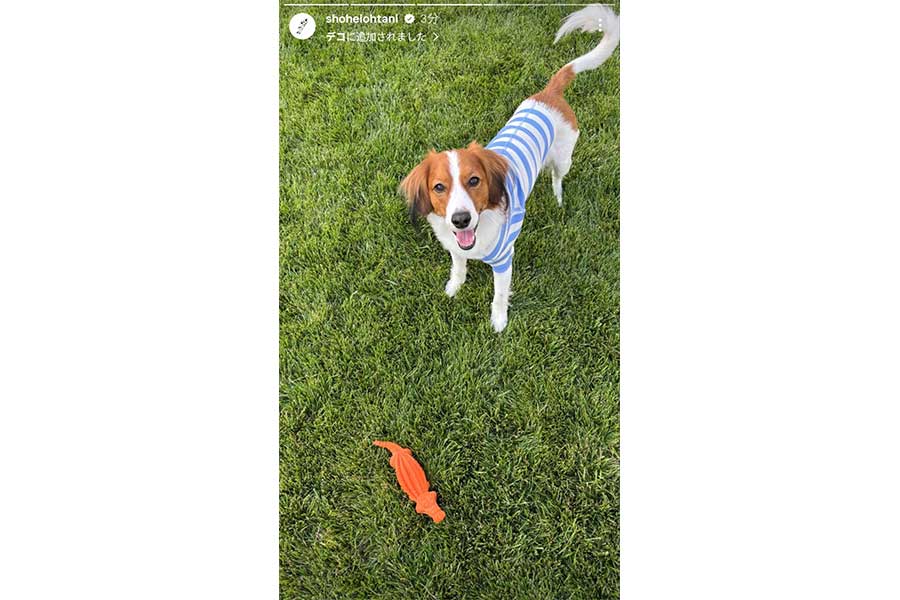大谷はインスタグラムのストーリー機能で遊ぶデコピンなど4枚の写真を投稿。水色と白のボーダー柄の服を着たデコピンが木に登ったり、オレンジ入りのワニ型のおもちゃを噛んだり、最後にはデコピンがおもちゃを空に放り投げたかのような写真も公開されていた。