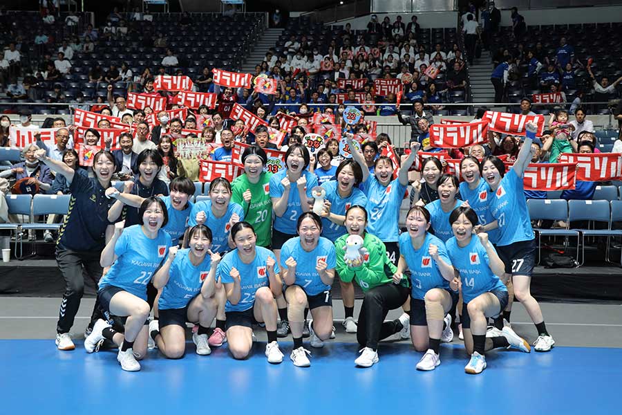 初出場、初優勝で初代王者へー。ハンドボール女子の香川銀行シラソル香川が、大きな野望に向けて一歩前進した。リーグHのプレーオフ(PO)が13日、東京・国立代々木第一体育館で開幕。レギュラーシーズン(RS)5位でPO初挑戦の香川銀行シラソル香川が、1回戦でRS4位の熊本ビューストピンディーズに27-24で逆転勝ちした。「下剋上」を狙う香川銀行は、14日にRS1位のブルーサクヤ鹿児島に挑む。