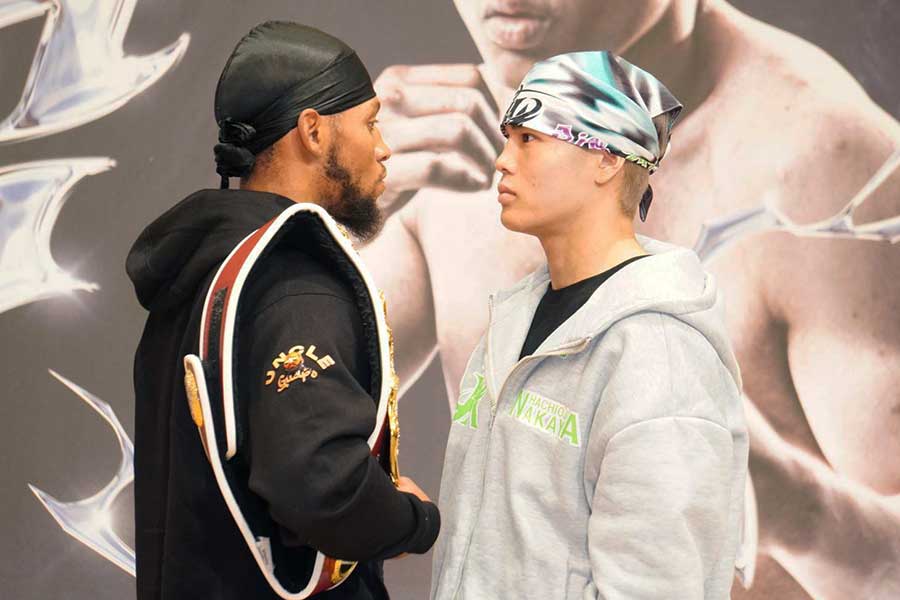殺気をまとって火花を散らした。会見ではともにバンダナを頭に巻いて登場した王者と挑戦者。フォトセッション後には約20秒のフェースオフ。20センチ程の距離で、互いの顔を真っすぐ見つめた。にらみ合う2人は終了の合図にも応じず、間に割って入った司会者に制止され、ようやくその場を離れた。