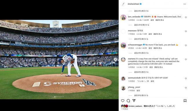 【画像】大谷の投稿にシュワちゃんが反応した実際のコメント(画像は大谷翔平のインスタグラムのスクリーンショット)
