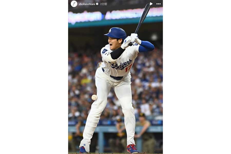 米大リーグ・ドジャースの大谷翔平投手は17日(日本時間18日)、本拠地パドレス戦に「1番・DH」で先発出場。3回の第2打席で右足に死球を受けた。球場はブーイングが飛ぶなど騒然となり、抗議に出たデーブ・ロバーツ監督が退場処分を受けた。試合後、大谷は自身のインスタグラムのストーリー機能を用いて、この“瞬間”の写真を投稿した。