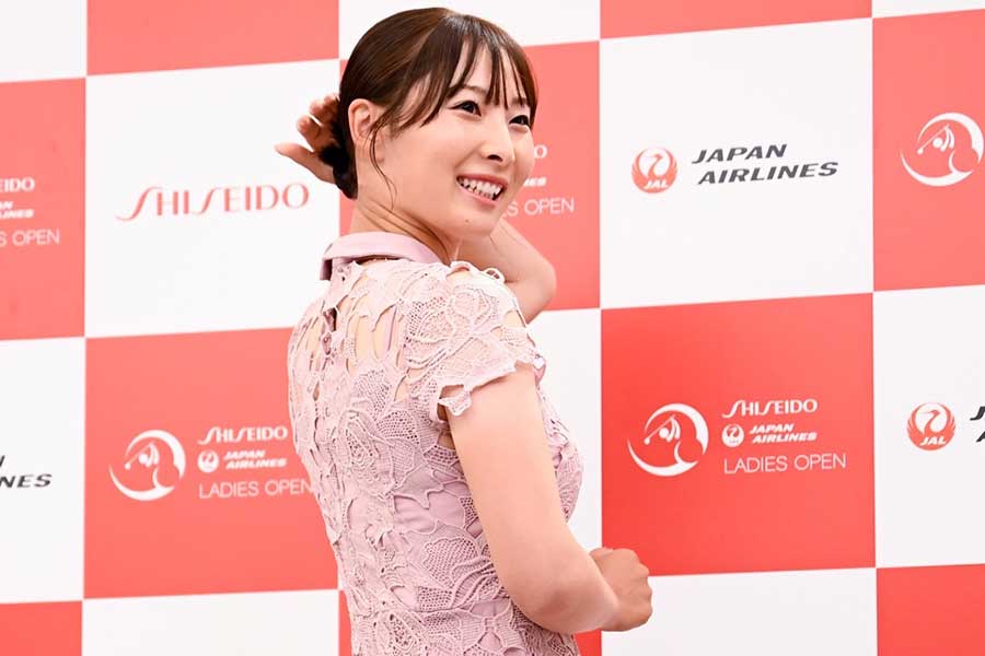 艶やかドレスで照れ笑い、25歳鶴岡果恋「女性をイメージ」 前夜祭プロメイクでひと際の存在感【女子ゴルフ】
