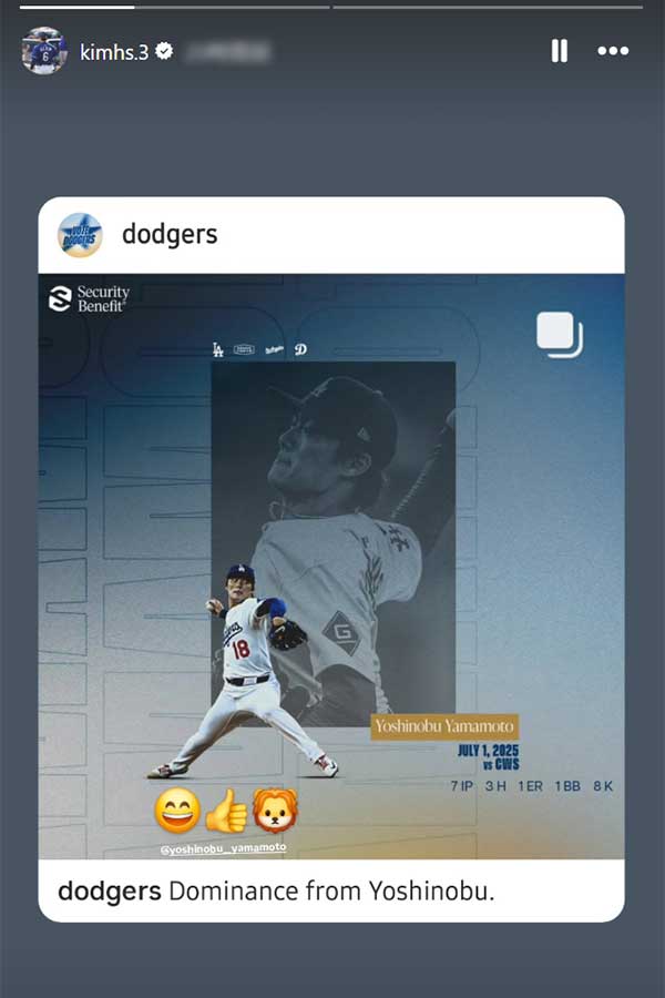 【画像】山本由伸へ、キム・ヘソンが茶目っ気たっぷりに投稿した絵文字