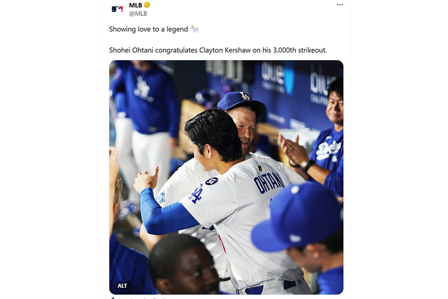 6回にキャプラーを見逃し三振として金字塔を打ち立てたカーショー。大歓声を浴び、ベンチに戻った左腕をチームメートが祝福した中、MLB公式Xが公開した1枚の写真では、大谷がカーショーを抱擁する瞬間が収められていた。