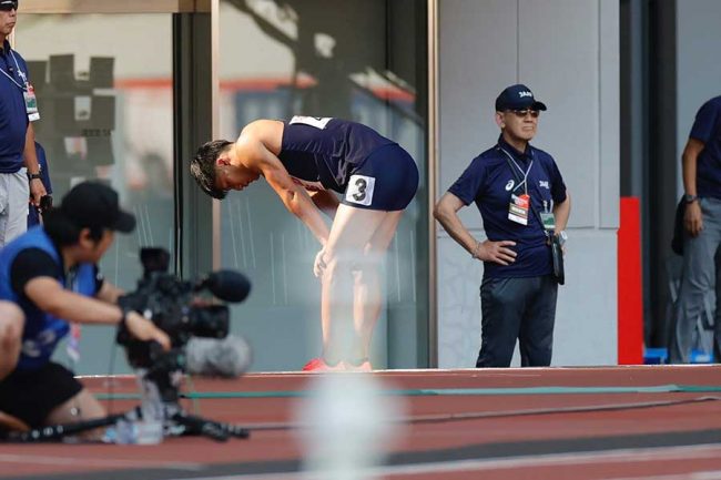 男子100mで波乱連続 サニブラウン10秒45で予選敗退「精一杯はやった」 V候補・柳田大輝もフライングで涙の失格「何もないっす」【陸上日本選手権】 2025.07.04 著者 : THE ANSWER編集部 キーワード : サニブラウン・ハキーム Twitter Facebook B!Bookmark まさかのフライング失格で肩を落とす柳田大輝の様子【写真:奥井隆史】 こちらもオススメ▶︎陸上界に飛び込んできたビッグニュースに驚き「ビッグ夫婦が誕生」「びっくり!」