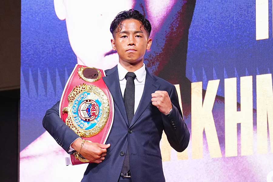 武居はWBOの赤いベルトを前に、落ち着いた表情で座った。5月の前戦でユッタポン・トンデイ(タイ)に初回2分7秒TKO勝ち。圧倒的な強さで勝利を収めた。闘志を燃やし続ける28歳。次回対戦するメディナについて「ガンガン前に来る強い選手なのでモチベーションが高いです」と力を込めた。