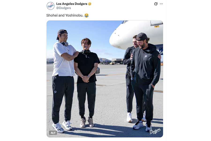 大谷と由伸が背比べ? 隣でカーショーは凝視…球団公式が泣き笑いしたオールスター出発前のお茶目な1枚