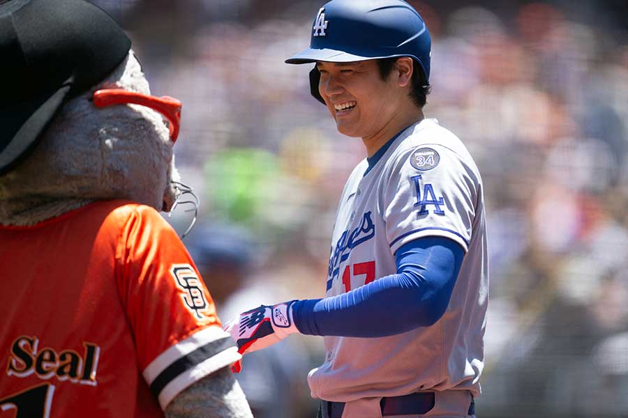 米大リーグ・ドジャースの大谷翔平投手は13日(日本時間14日)、敵地ジャイアンツ戦に「1番・DH」で先発出場し、3打数1安打だった。チームは延長の末5-2で勝利し、前半戦を白星締め。大谷は敵軍マスコットとも交流していた。その裏側をマスコットが明かしている。