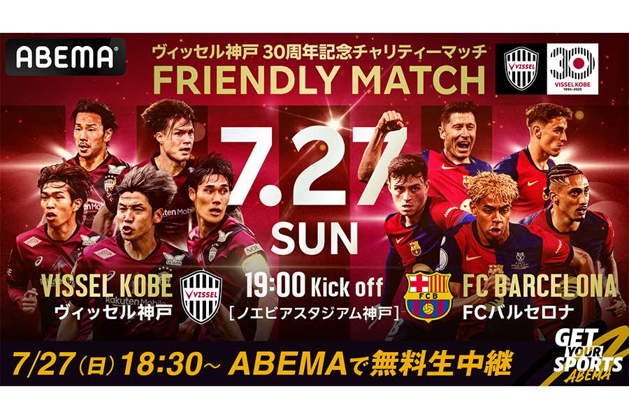 新しい未来のテレビ「ABEMA(アベマ)」は、27日に開催されるJ1神戸の30周年記念チャリティーマッチ「ヴィッセル神戸 vs FCバルセロナ」を無料生中継する。キックオフは19時に予定されている。