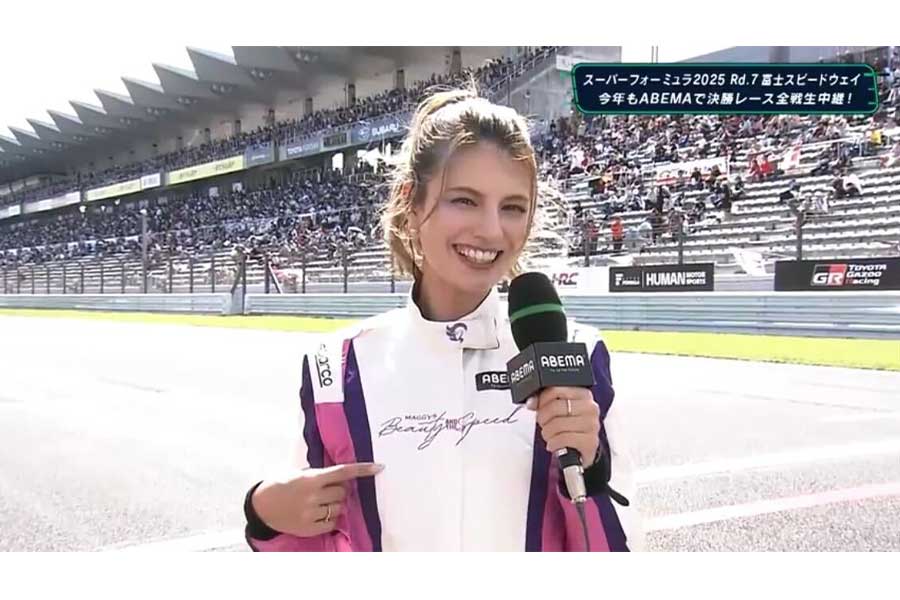 マギーはこの日、イタリアの名門モータースポーツブランド・スパルコ(Sparco)とともに制作した完全オリジナルのレーシングスーツを初披露。中継で「私の好きなピンクとパープルを基調に作ってます」と説明した。快晴のサーキットを背景に、笑顔を見せながらスタート前の中継リポートにも参加。その後、チェッカーフラッグを振る大役も務めた。