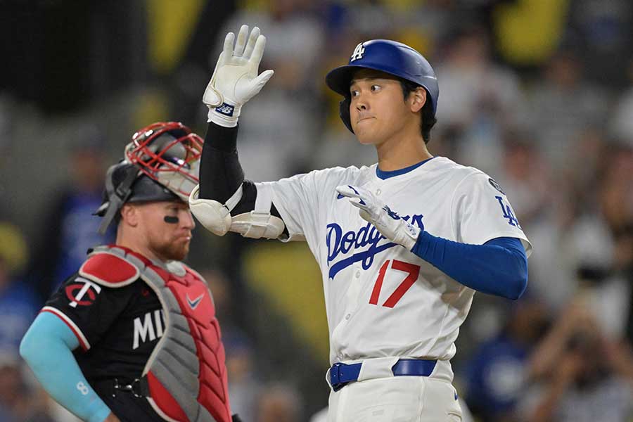米大リーグ・ドジャースの大谷翔平投手は22日(日本時間23日)、本拠地ツインズ戦に「2番・DH」で先発出場。5点ビハインドの9回に自身初の4試合連発となる36号2ランを放った。今季被本塁打0の相手守護神からの一発に、敵地中継局の解説も脱帽。次打者の紹介中にも大谷の絶賛を続ける興奮っぷりだった。