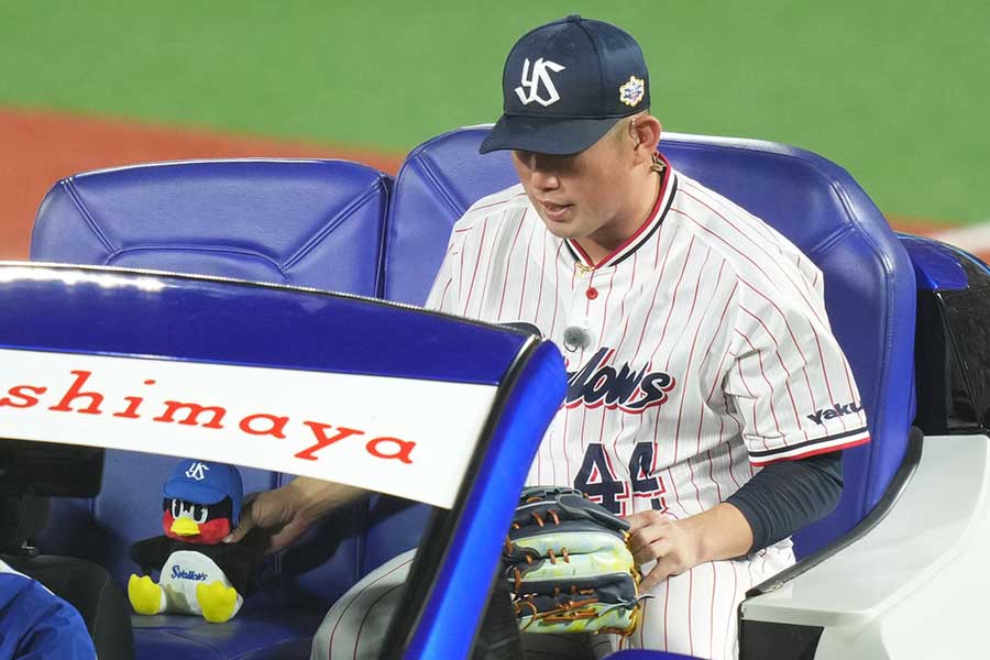 ヤクルト大西とリリーフカーに…その後はベンチ最前列で観戦