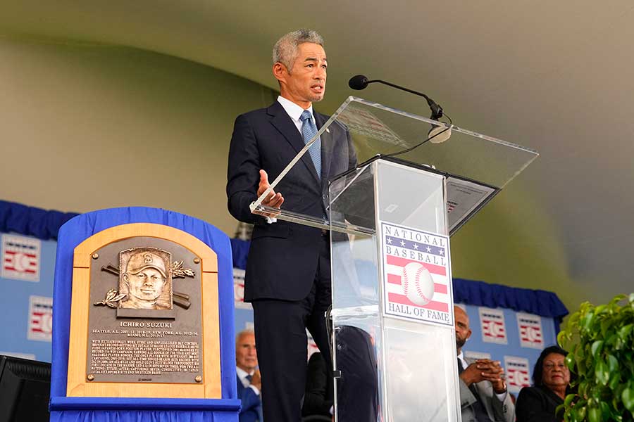 マリナーズなどで米大リーグ通算3089安打をマークし、アジア選手初の米野球殿堂入りを果たしたイチロー氏が27日(日本時間28日)、ニューヨーク州クーパーズタウンで表彰式典に出席した。英語で行った約19分間のスピーチでは、全米の野球ファンを爆笑に包むシーンもあった。