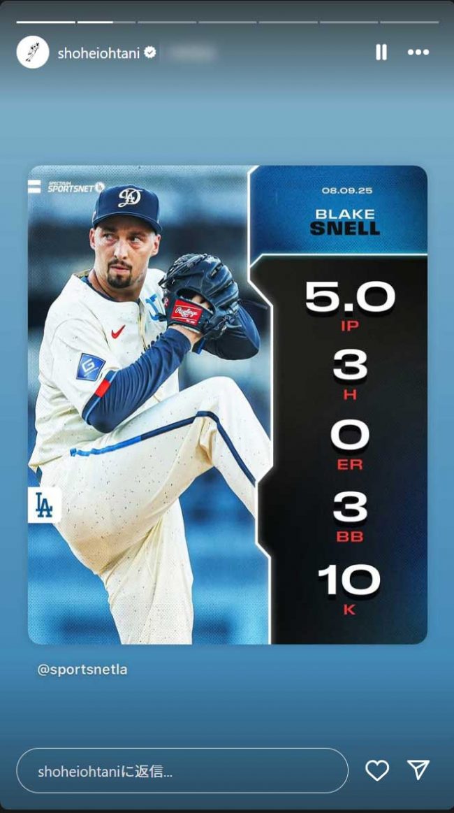 大谷翔平、節目40号より先に称えた同僚の復活 勝利後SNS更新、さすがCY賞左腕の5回10K 2025.08.10 著者 : THE ANSWER編集部 キーワード : ドジャース • 大谷翔平 Twitter Facebook B!Bookmark 【画像】節目の40号より…大谷が同僚を称えた実際の投稿(画像は大谷翔平のインスタグラムのスクリーンショット) こちらもオススメ▶︎大谷翔平の最新ニュースをチェック