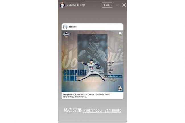 山本由伸の完投後、スネルが送った愛の日本語 インスタに4文字、NLCSでは「I love YAMA」 2025.10.26 著者 : THE ANSWER編集部 キーワード : ドジャース • 山本由伸 Twitter Facebook B!Bookmark 【動画】「私の兄弟」 山本由伸の完投後、スネルが愛を示した実際の投稿 (画像はスネルのインスタグラムストーリーのスクリーンショット) こちらもオススメ▶︎ドジャースの最新ニュースをチェック