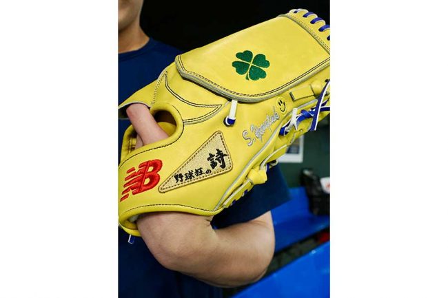 ソン・ヨンタクが着けるNBのグラブには「野球狂の詩」の文字【写真:羽鳥慶太】